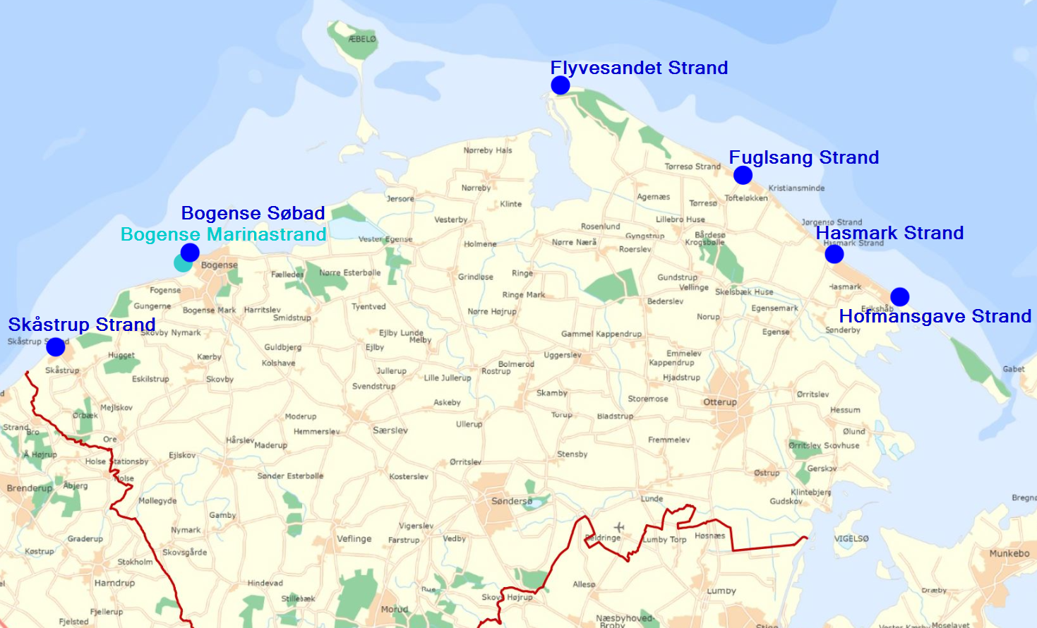 Hasmark Strand er Nordfyns mest benyttede strand, hvor der ligeledes er mulighed for handicapbadning, og hvor man - ved henvendelse til Hasmark Strandcamping kan låne en handicap-badestol. Ved Fuglsang Strand er der store grønne områder, hvor man kan boltre sig med en hyggelig fodboldkamp og lignende. Det Blå Flag vejrer over Hasmark Strand, Hofmansgave Strand, Fuglsang Strand, Flyvesandet Strand, Bogense Søbad og Skåstrup Strand.