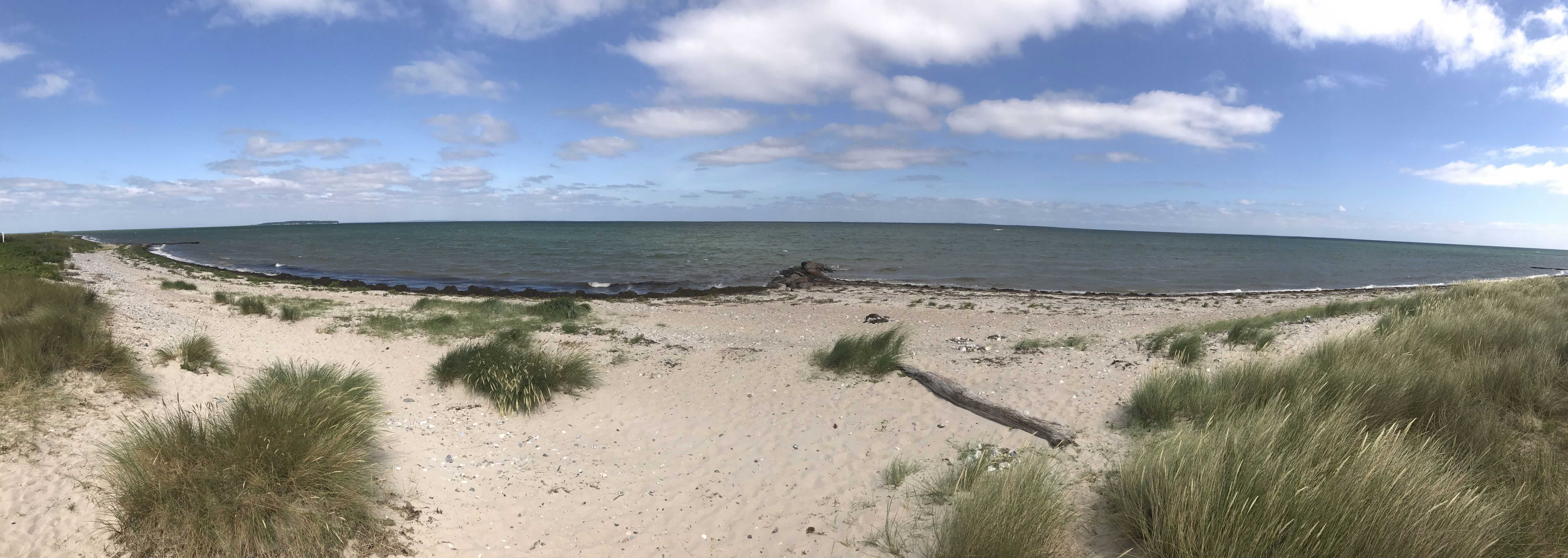 Langs med stranden er der opført tværgående høfder af store sten. Havbunden ud for stranden udgøres af fint sand med småsten og få mellemstore sten spredt over bunden.