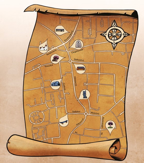 Bogen tager jer rundt i Søndersø. I finder vej enten ved at bruge kortet i bogen eller via QR-koder i bogen, der linker til GoogleMaps. I ved, at I har fundet det rigtige sted, når I ser en træpæl med en betonbog ovenpå.