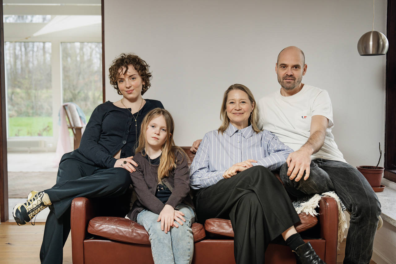 Bjørk Storm Engelshardt Kirkegaard og fynske Luna Fuglsang Svelmøe spiller parrets to børn, mens Trine Dyrholm og David Dencik som forældrene ses sammen i familiens hus i Bogense. Foto: Martin Dam Kristensen