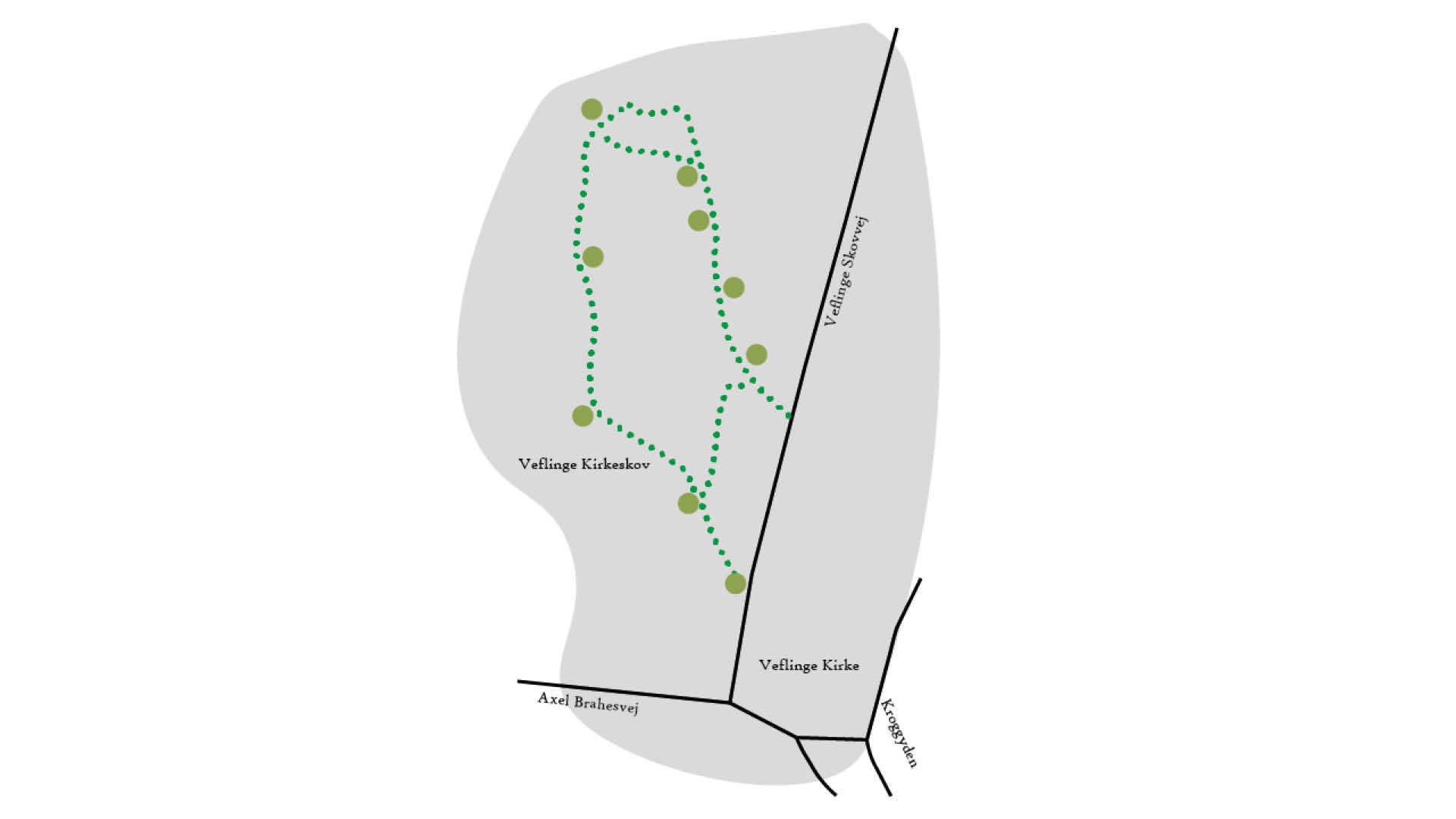 De ni poster udgør tilsammen en troldejagt. Ved at følge stien rundt i Veflinge Kirkeskov kommer I automatisk forbi de ni poster. Ved hver post er der et spørgsmål, hvor svaret findes i jeres omgivelser. I kan nøjes med blot at svare enkelte poster, eller I kan gå hele jagten på den cirkulære tur rundt i området.